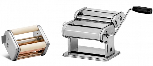 Предварительная раскатка не требуется, нужно разделить тесто на небольшие порции около 80-100 г. Перед началом раскатывания стоит выставить максимальную ширину между валиками с помощью механической рукояти, вращать нужно по часовой стрелке до упора. После того, как тесто преобразовалось в пласт толщиной 3 мм — ширину между валиками нужно уменьшить до необходимой вам толщины будущей пасты (от 0,5 до 1 мм). Теперь стоит определиться: какой вид пасты хотите получить (тальолини или феттучине) и пропустить полученную заготовку через выбранную насадку.