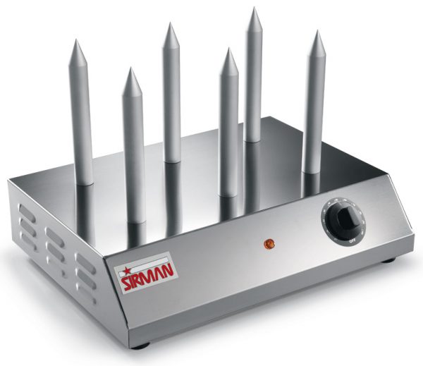 Аппарат для приготовления хот-догов Sirman Roberto 6 – используется на предприятиях фаст-фуда для приготовления хот-догов. Конструкция состоит из 6 штырей подогрева. Нагрев производится при помощи ТЭНов. Электромеханическая система управления. Корпус изготовлен из нержавеющей стали.