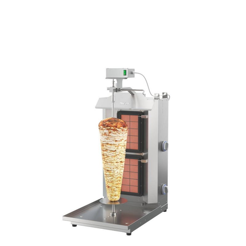 Гриль для шаурмы Атеси Шаурма-2-Газ-05-Н– газовый аппарат для приготовления шаурмы. Гриль предназначен для коммерческого использования, подходит для применения в качестве оборудования в торговых точках и пунктах общественного питания. Его конструкция адаптирована для приготовления мясной начинки для шаурмы (шавермы). В аппарате предусмотрено 3 газовых горелки с беспламенной системой горения.