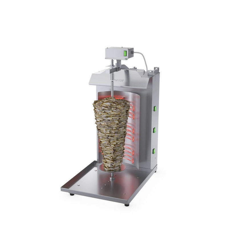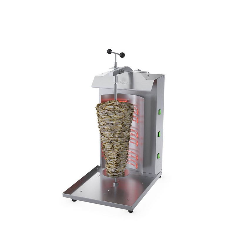 Гриль для шаурмы Атеси Шаурма-3-Эл-05-Н (с ручным приводом)– представитель серии оборудования для заведений быстрого питания: бистро и стрит-фудов для приготовления горячего восточного блюда – шаурмы. Принцип эксплуатации оборудования – насаживание мясного филе на вертикальную стойку и сформирование мясного цилиндра с последующей жаркой бесконтактным способом при помощи инфракрасного нагрева.