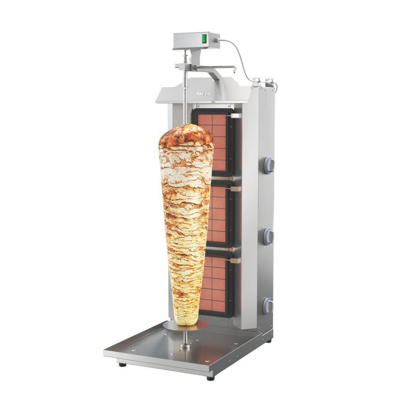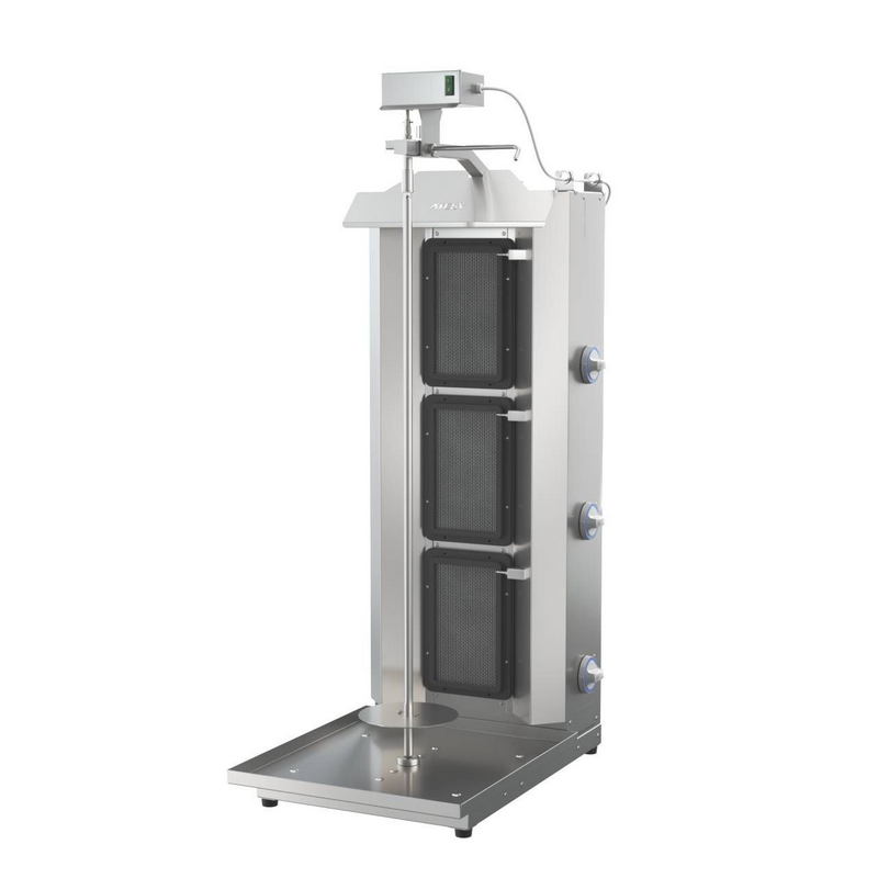 Гриль для шаурмы Атеси Шаурма-3-Газ-05-Н– газовый аппарат для приготовления шаурмы. Гриль предназначен для коммерческого использования, подходит для применения в качестве оборудования в торговых точках и пунктах общественного питания. Его конструкция адаптирована для приготовления мясной начинки для шаурмы (шавермы). В аппарате предусмотрено 3 газовых горелки с беспламенной системой горения.
