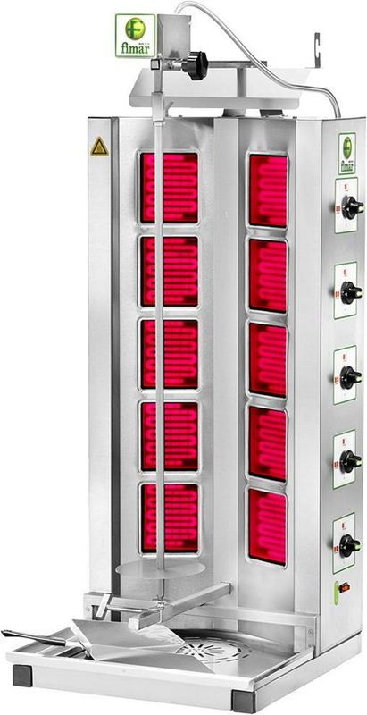 Аппарат для шаурмы FimarGYR100— современная модель аппарата для шаурмы, выполненная из нержавеющей стали (корпус, шампур, поддон, лопатка), установлено жаростойкое защитное стекло. Предназначен для приготовления шаурмы, кебабов, жарки мяса и курицы. ТЭНы закрыты жаростойким защитным стеклом, что облегчает очистку и способствует экономии электроэнергии. Корпус, шампур, поддон для сбора отходов и лопатка для сбора мяса изготовлены из нержавеющей стали. Применена посекторная регулировка ТЭНов.