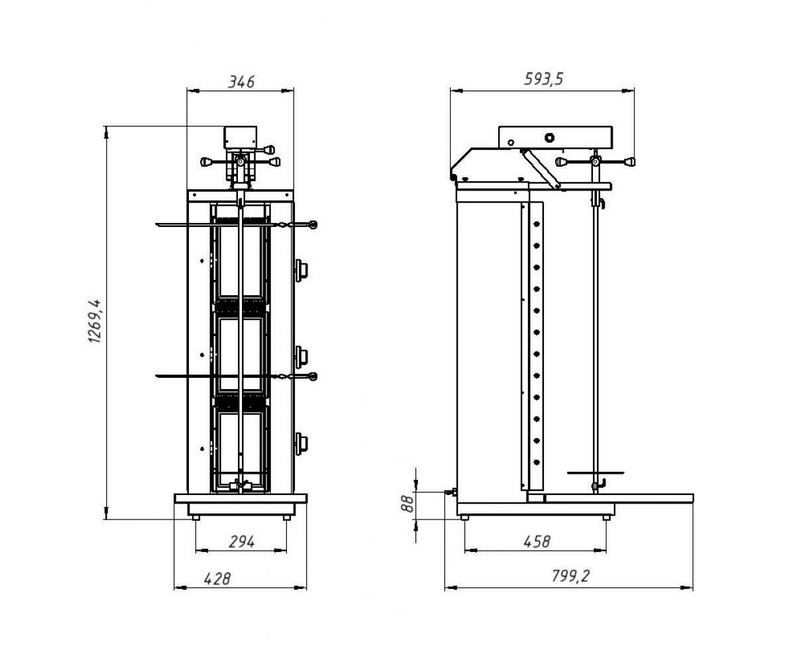 - Скорость приготовления мяса регулируется газовым краном, изменяя подачу газа к горелкам, изменяем температуру газовых горелок. Скорость приготовления мяса также зависит от изменения расстояния между шампуром с мясом и газовыми горелками. Это расстояние изменяется с помощью консоли и винтов.