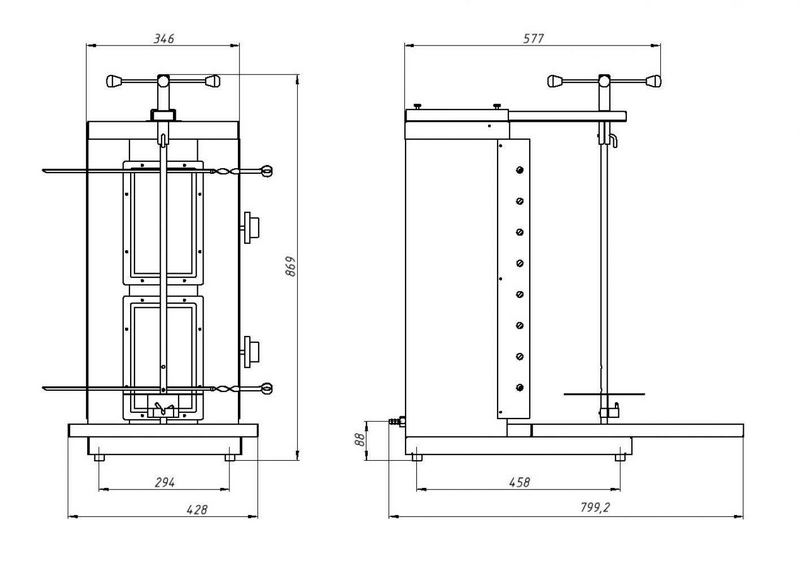 - Скорость приготовления мяса регулируется газовым краном, изменяя подачу газа к горелкам, изменяем температуру газовых горелок. Скорость приготовления мяса также зависит от изменения расстояния между шампуром с мясом и газовыми горелками. Это расстояние изменяется с помощью консоли и винтов;