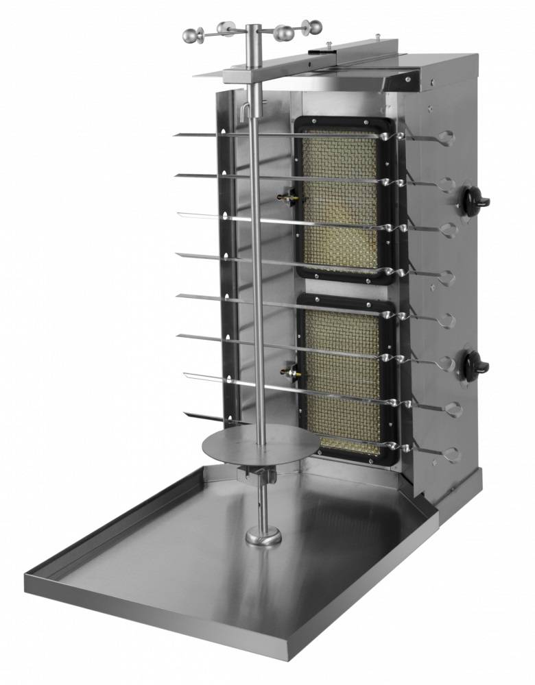 Гриль для шаурмы GRILL MASTER Ф2ШМГпредназначен для запекания специально подготовленного свиного, говяжьего, бараньего и куриного мяса, используемого для приготовления шаурмы, на предприятиях общественного питания и торговли. Настольная модель с возможностью подключения как с газомагистрали (природный газ), так и к баллонной установке со сжиженным газом. Простое устройство аппарата гарантирует надежную работу в течение длительного времени.