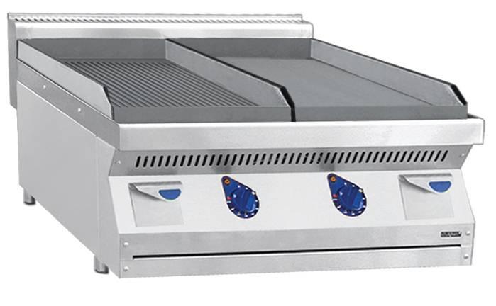 - 2 независимых зоны нагрева (выполнены из чугуна), гладкая и рифленая поверхности разделены перегородкой (площадь — 0,44 м2, размер — 2x 395×650 мм)