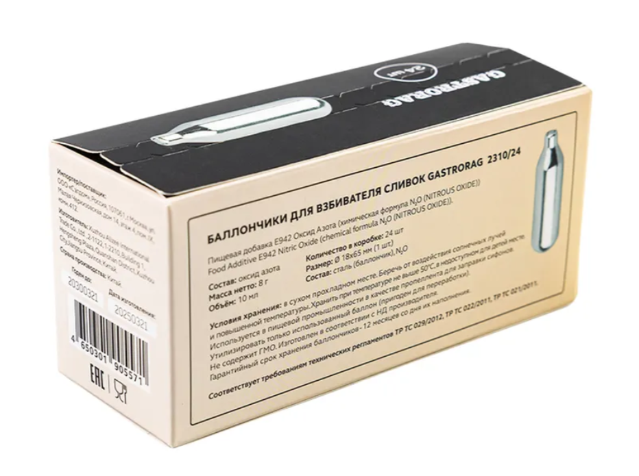 Баллончики для взбивателя сливок Gastrorag 2310 8 г N2O, 24 шт. в упаковке купить с гарантией в Москве по низкой цене с доставкой по России у официального дилера. Возможность покупки в кредит