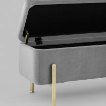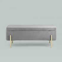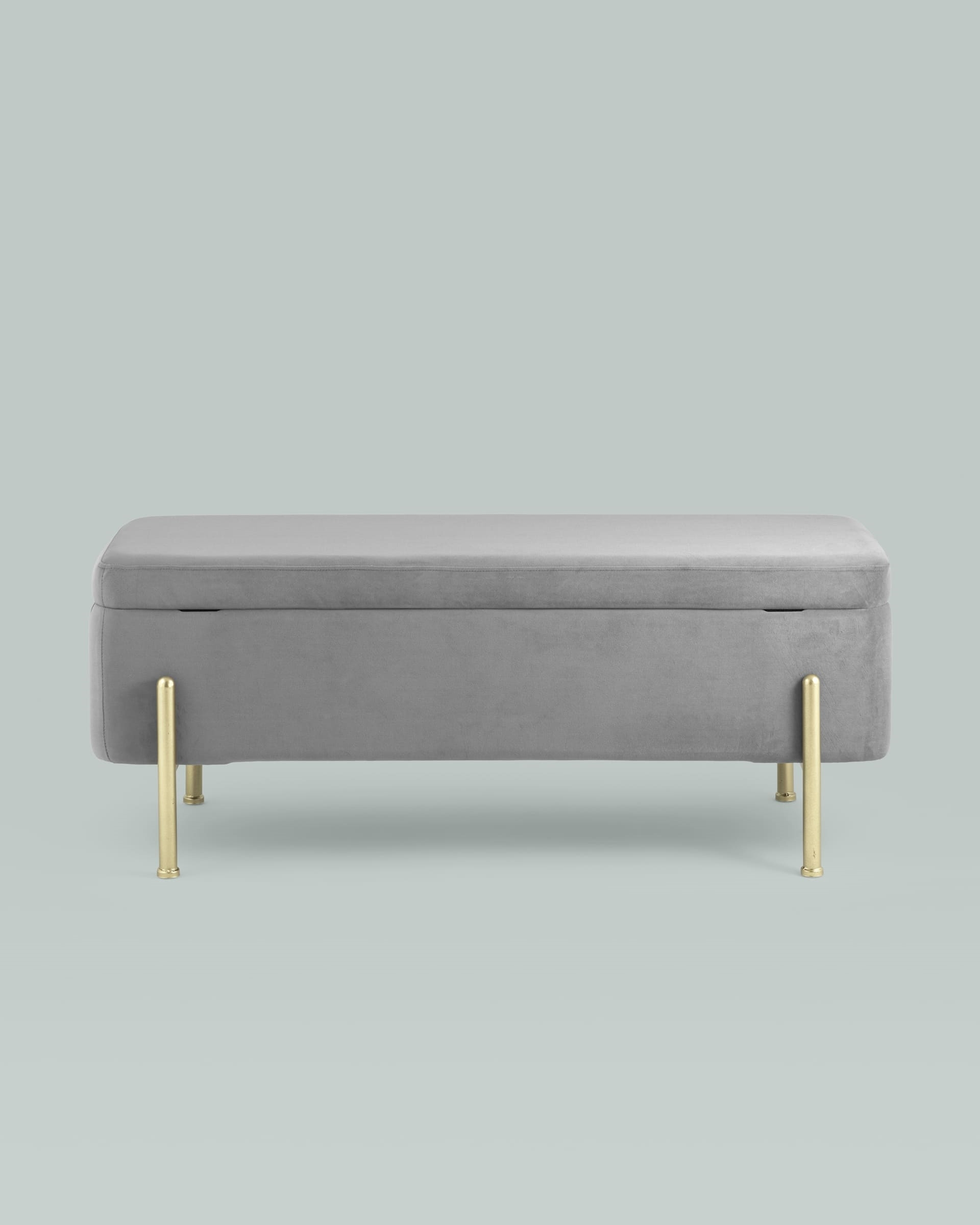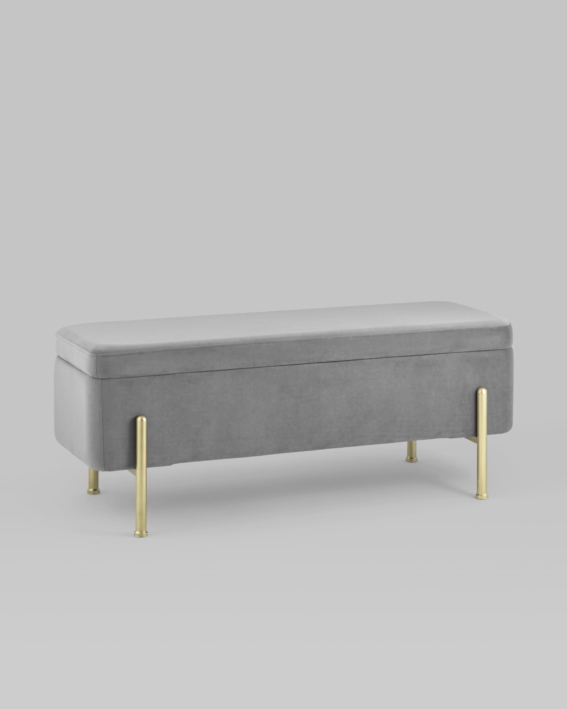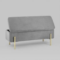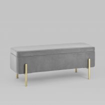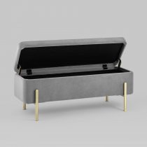Стильная модель банкетки в обивке из мягкого велюра, прекрасно дополнит интерьер спальни или прихожей. Изящные ножки выполнены из металла в золотом цвете. Под сидением имеется ящик для хранения необходимых вещей. На ножках предусмотрены мягкие накладки, которые предотвращают повреждения напольного покрытия.