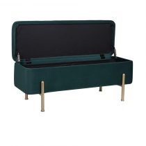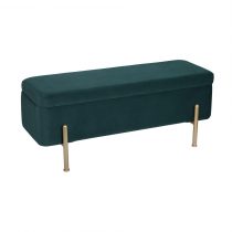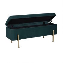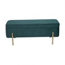 Стильная модель банкетки в обивке из мягкого велюра, прекрасно дополнит интерьер спальни или прихожей. Изящные ножки выполнены из металла в золотом цвете. Под сидением имеется ящик для хранения необходимых вещей. На ножках предусмотрены мягкие накладки, которые предотвращают повреждения напольного покрытия.