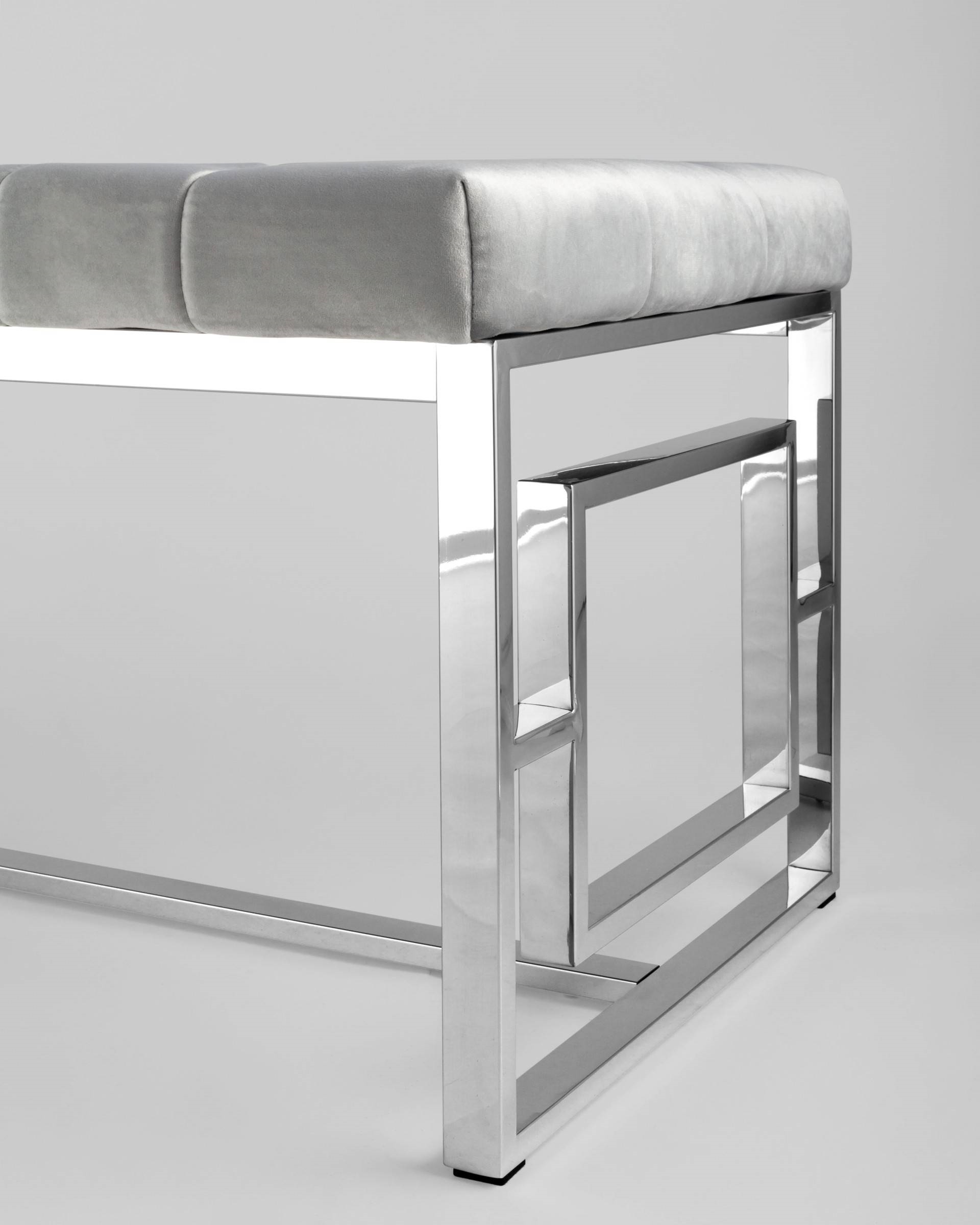 Банкетка выполнена из нержавеющей стали, что делает конструкцию прочной и надежной. Обивка сиденья – велюр. Материал обладает особой прочностью и износоустойчивостью, приятный на ощупь, эластичный и теплый.