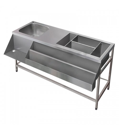 Комплектация: полки, накопители для бутылок с напитками (1 сварной, 1 съемный), моечная ванна цельнотянутая, моечная ванна сварная со сьемыми перегородками (3шт), полка под блендер. Возможно изготовление по индивидуальным размерам и пожеланиям.