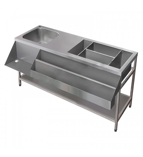 Комплектация: полки, накопители для бутылок с напитками (1 сварной, 1 съемный), моечная ванна цельнотянутая, моечная ванна сварная со сьемыми перегородками (3 шт), полка под блендер, нот-бокс, бункер для мусора, полка сплошная из нерж. стали. Возможно изготовление по индивидуальным размерам и пожеланиям.