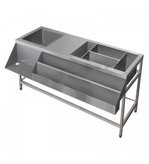 Комплектация: полки, накопители для бутылок с напитками (1 сварной, 1 съемный), моечная ванна сварная, моечная ванна сварная со сьемыми перегородками (3 шт), полка под блендер, нот-бокс, бункер для мусора, полка сплошная из нерж. стали. Возможно изготовление по индивидуальным размерам и пожеланиям.