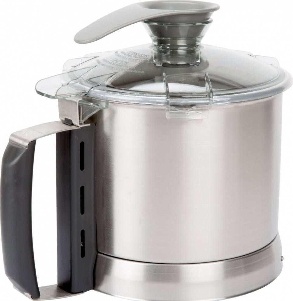 Измельчение происходит в чаше из нержавеющей стали. Ее объем – 4,5 литра. Для удобства на сосуде установлена рукоятка. В качестве рабочего элемента используется нож с мелкими зубцами. На корпусе установлена крышка с герметичным притвором, оснащенная скребком.