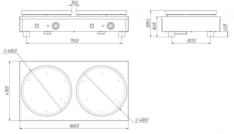 • Управление производится с фронтальной панели, где для каждой рабочей поверхности установлены отдельные клавиши пуска, поворотные регуляторы температуры, индикаторы питания и нагрева.