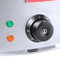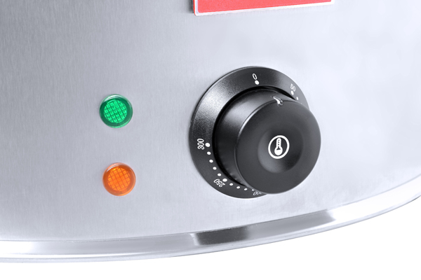 Выполнен аппарат из коррозионно-стойкой стали. Регуляторная панель электромеханическая. Термостатическое автоотключение/автовключение, активирующееся при превышении/понижении диапазона температур от установленных. Регулятор дисковый, светодиодные индикаторы включения и выключения подачи электроэнергии. Прилагается Т-образная лопатка из дерева для разравнивания теста. Не следует скоблить диск острыми металлическими предметами, чистить абразивами и жёсткими губками.