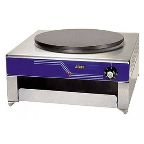 Блинница KocateqJB35имеет нержавеющий корпус, одну жарочную поверхность с тефлоновым покрытием — блины легко переворачиваются, не пригорают. Такой аппарат позволяет быстро и качественно готовить блины в кафе, заведениях фаст-фуда, закусочных. Порция теста наливается на конфорку и равномерно распределяется деревянным шпателем специальной формы, входящим в комплект оборудования. Блин готовится быстро, отлично пропекается. В аппарате предусмотрен подогреваемый выдвижной ящик, куда можно складывать для недлительного хранения готовые блины. Подключение блинницы 220В.