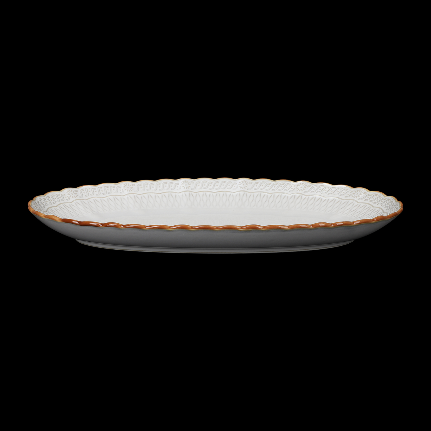 - Фактурный узор, словно кружево, украшает каждый предмет, придавая ему неповторимый шарм и элегантность, а кромка цвета корицы добавляет теплоты и пикантности, напоминая о пряных ароматах восточных базаров и уютных кофейнях.