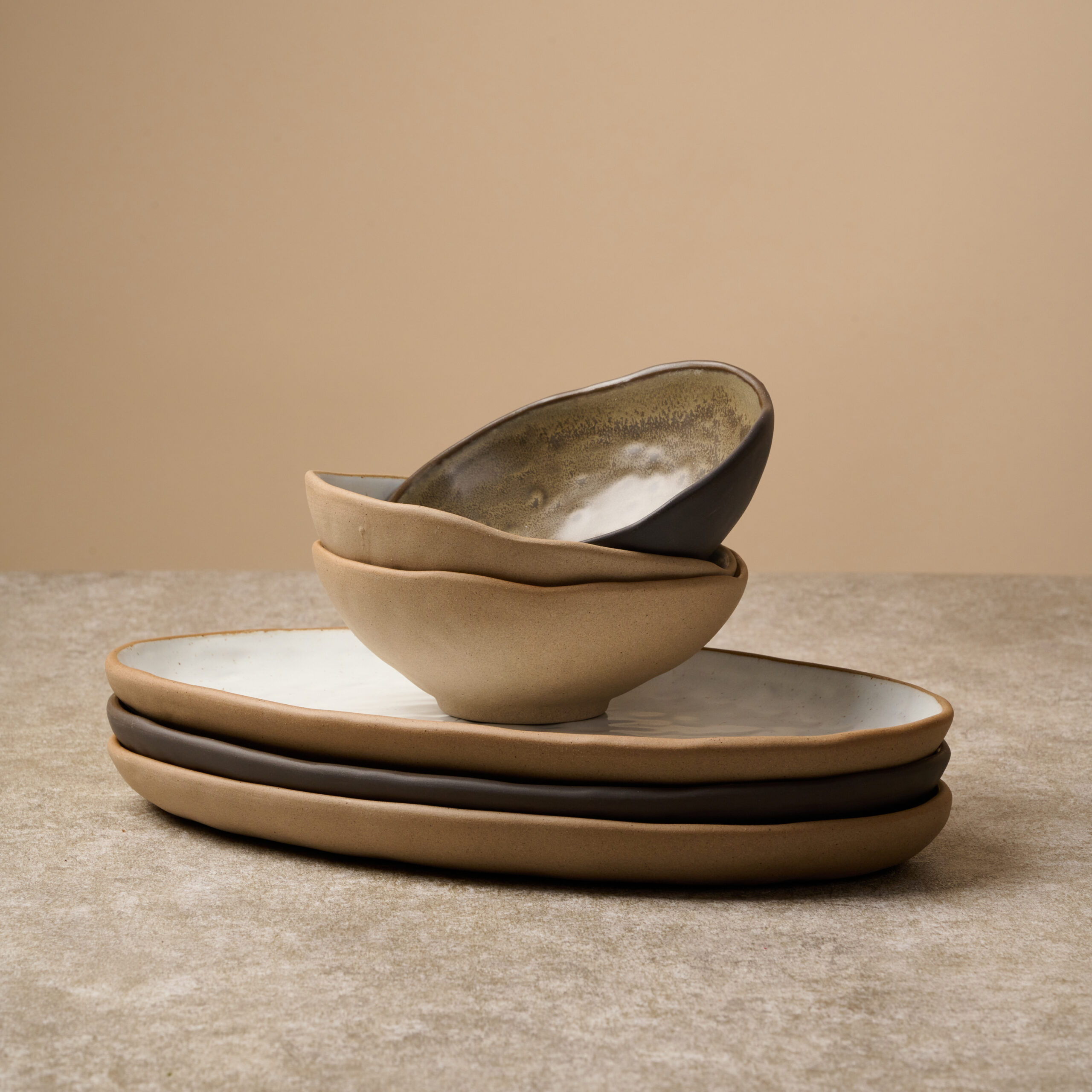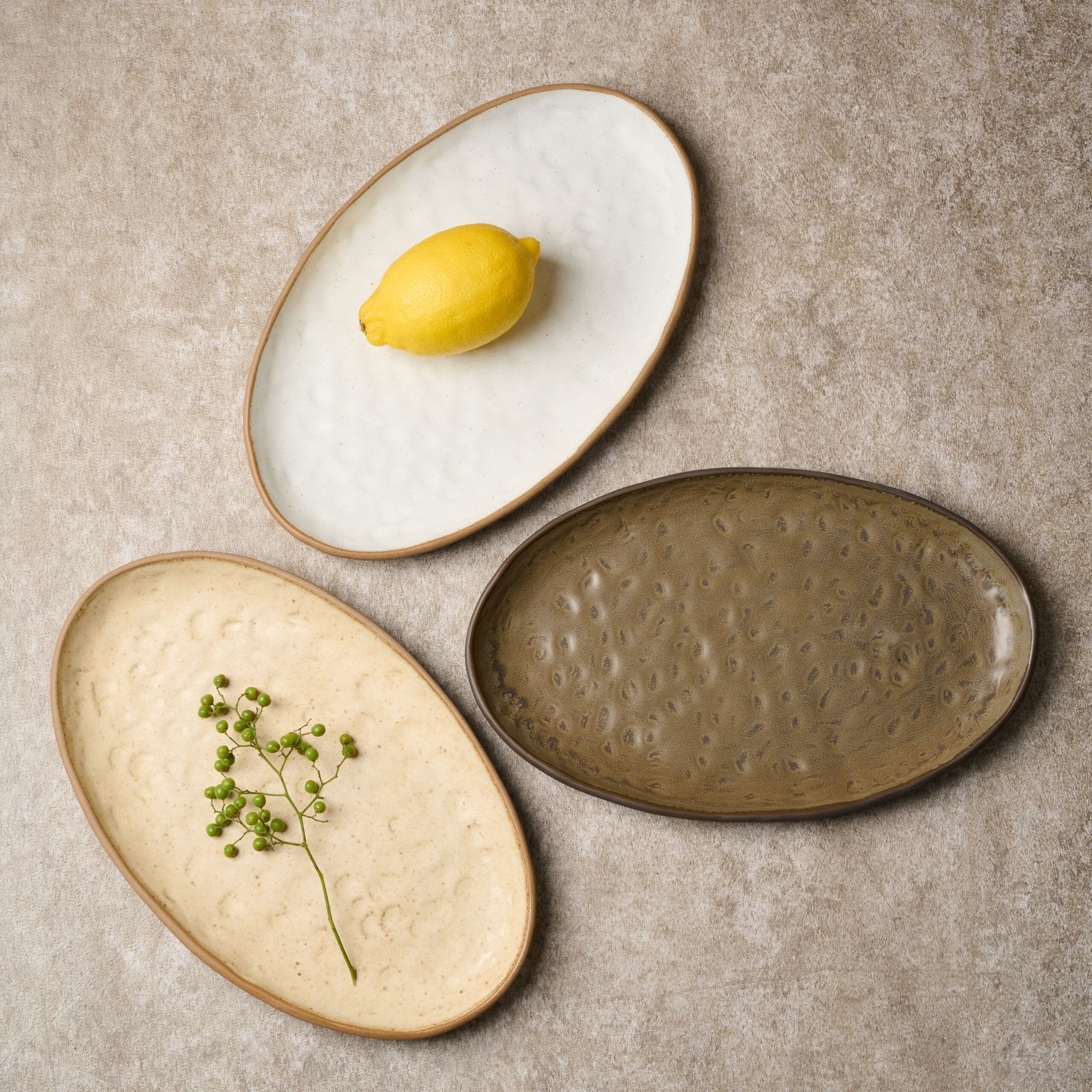 Коллекция представлена в теплой цветовой гамме, включающей оттенки белого, бежевого и глубокого коричневого цветов. Эта палитра помогает выделить блюдо, не отвлекая внимания от самого главного. Матовая поверхность и текстура создают интересную игру света, усиливающую восприятие вкуса и формы блюда.