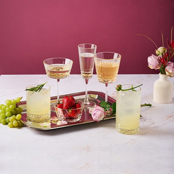 Серия включает 7 позиций, позволяющих создать полную и гармоничную сервировку: шампанское-блюдце, бокал-флюте, бокал для вина, изящный салатник, олд фэшн, хайбол и стопка.