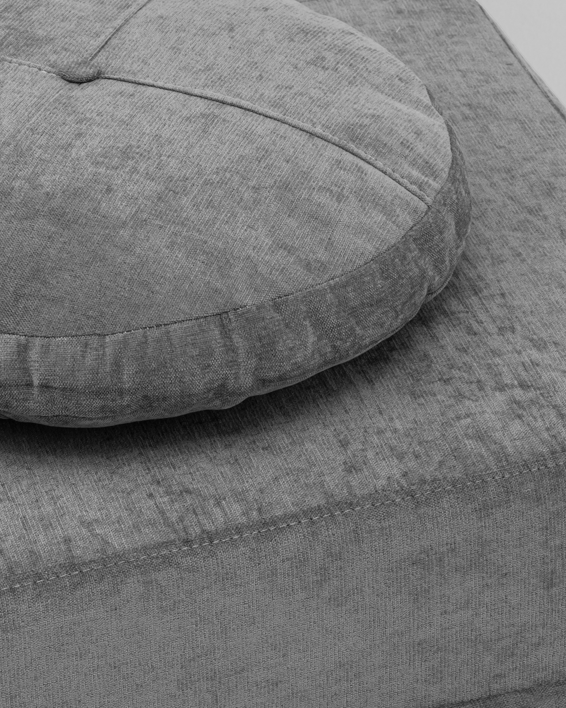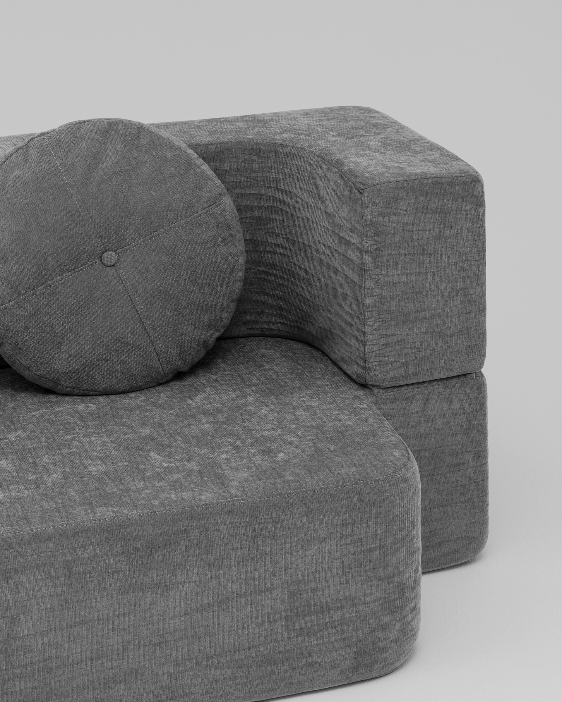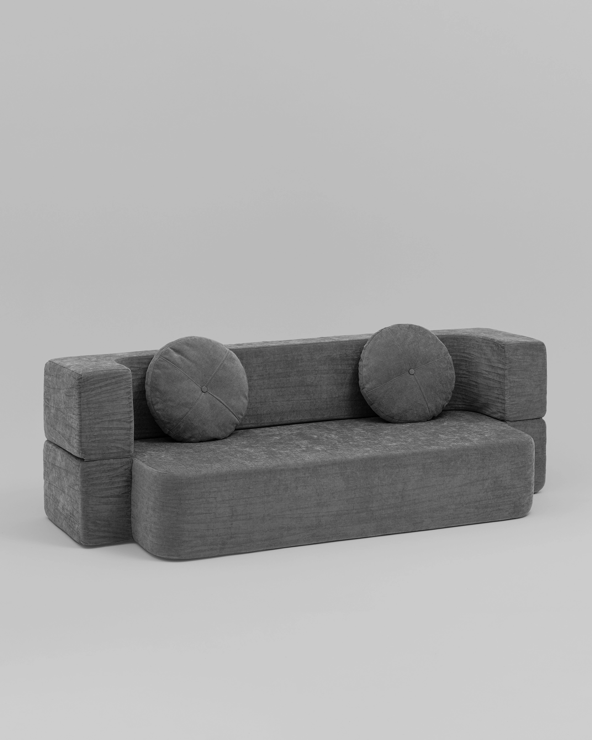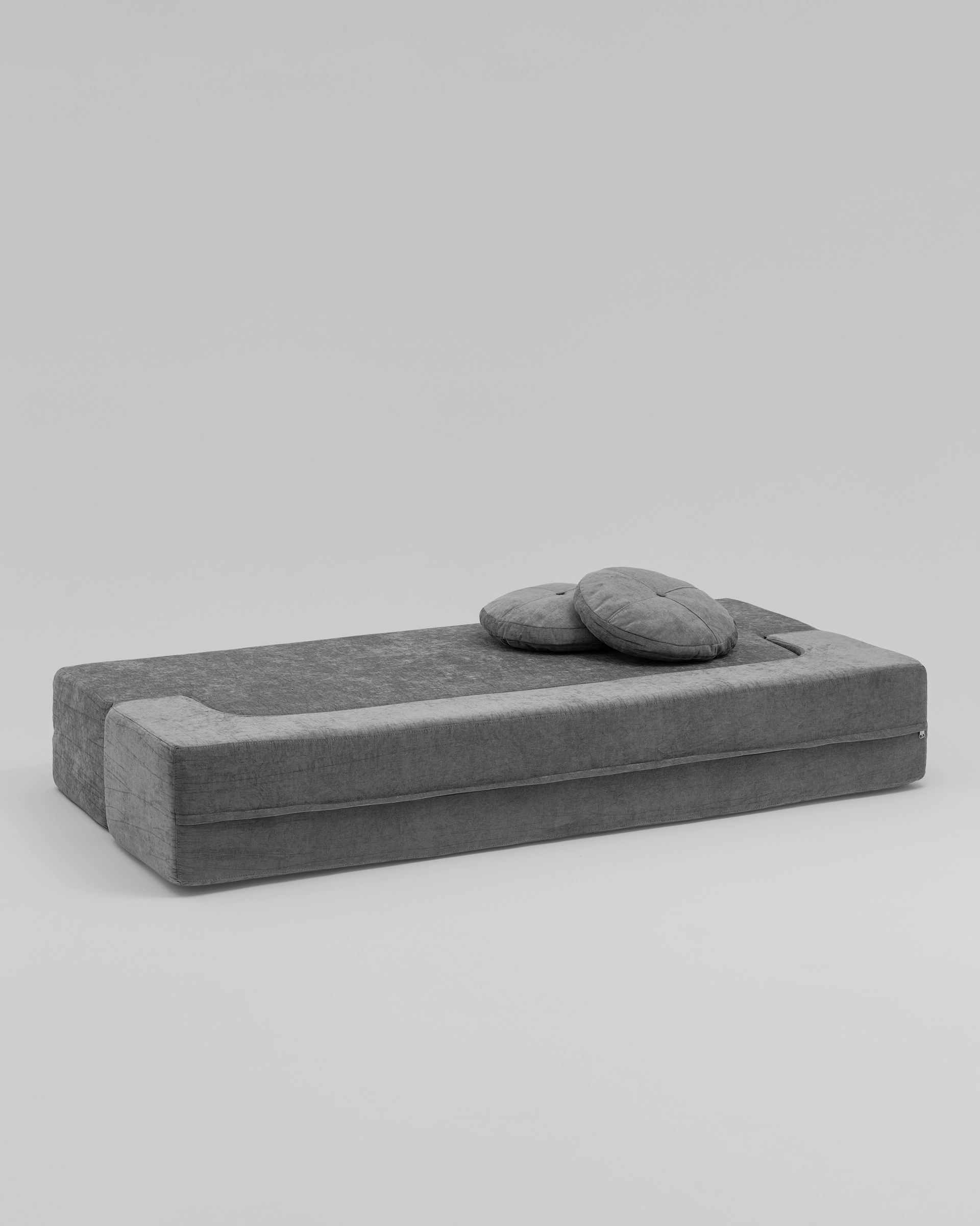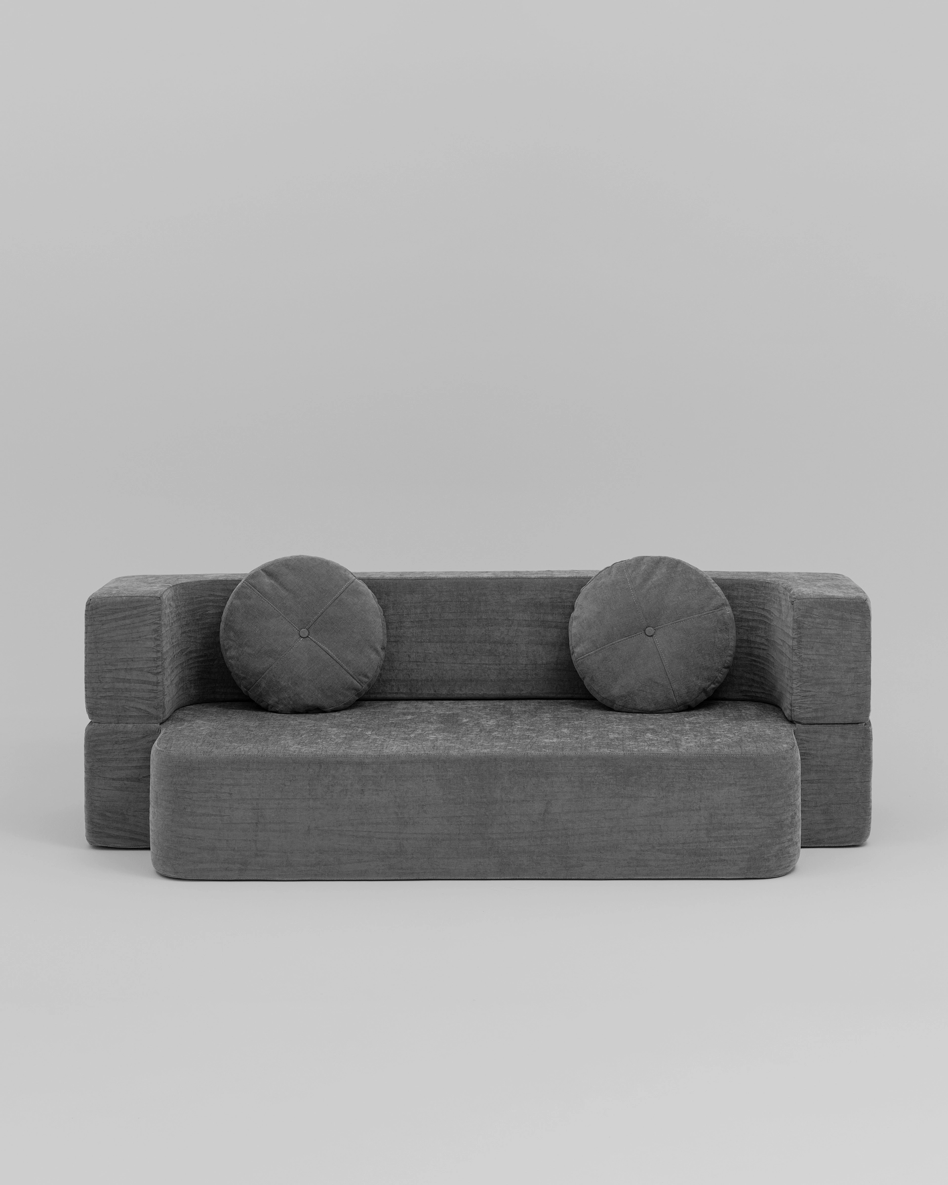ZipSofa — это дизайнерский бескаркасный диван с геометричной формой и выразительным силуэтом. Чёткие линии, лаконичный пепельно-серый оттенок и круглые подушки создают визуально сбалансированный акцент, который органично впишется в любой современный интерьер: от городской квартиры до загородного дома или креативного офиса.