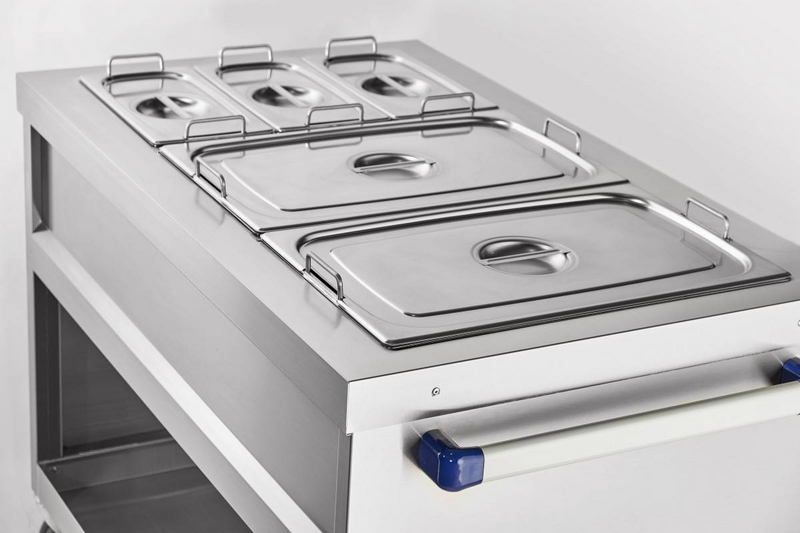 Корпус мармита изготовлен из листовой нержавеющей стали и имеет прямоугольную форму. Он снабжен двумя парами колес, одна из которых имеет стопорные механизмы. На сплошных боковых стенках расположены плоские ручки для удобства маневрирования и терморегулятор для нагревательных элементов. Сверху на корпусе установлена паровая ванна с двумя встроенными ПЭНами. Над ванной находится столешница с выемками для пяти гастроемкостей разного размера. Нагрев содержимого лотков производится паром от кипящей воды в ванной. Основание корпуса образует дополнительную открытую полку для кухонного инвентаря и посуды.