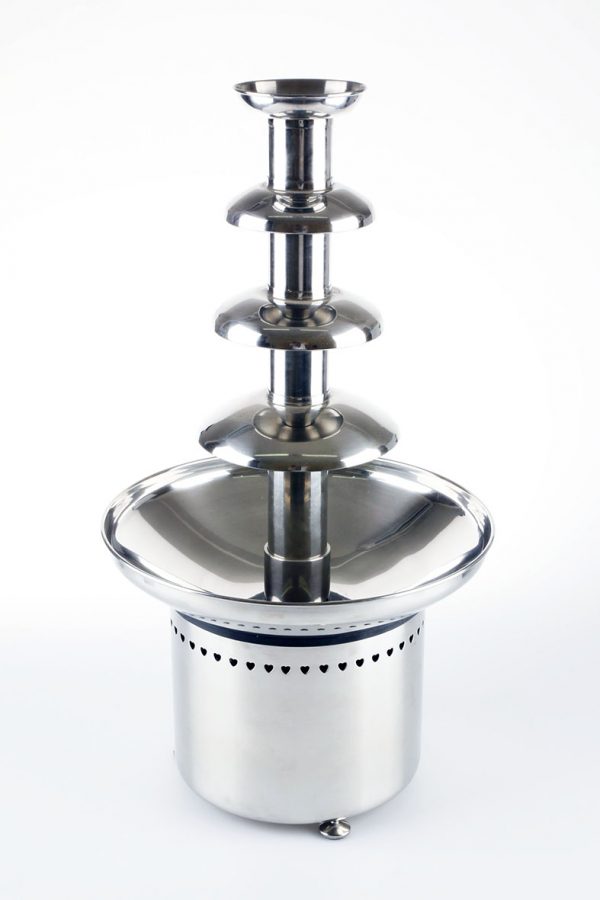 Конструкционно фонтан представляет собой основание в виде цилиндрической емкости, которая накрыта чашей для стекания шоколада. В центре емкости устанавливается 4-ярусная башня, внутри которой расположен шнек для продвижения продукта кверху. На боковой стороне основания находится панель управления с ручкой включения, регулятором температуры и индикатором сети. Все элементы прибора выполнены из пищевой нержавеющей стали. Для подбора устойчивого вертикального положения на основании предусмотрены регулируемые ножки. В фонтан данной модели можно класть как кусковой шоколад специального состава, так и уже расплавленный.