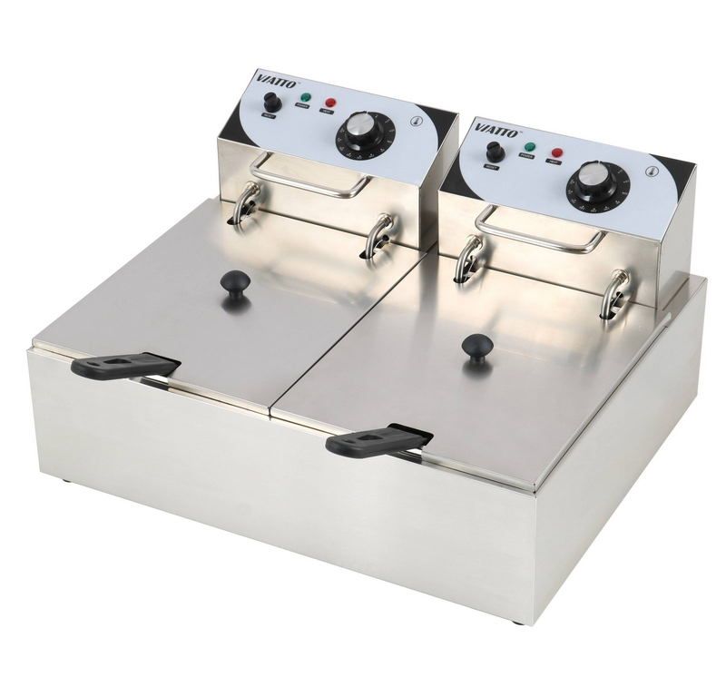 Viatto VA-EF082представляет собой фритюрницу профессионального класса. Модель отлично подходит для оснащения пунктов общественного питания, торговых точек. Изделие отличается высокой прочностью, корпус произведен из нержавеющей стали. В модели присутствует система защиты от перегрева. В конструкции предусмотрено две ванны объемом по 12 литров. Продукты загружаются в сетчатые корзины с термоизолированной рукояткой. На корпусе установлена механическая панель управления с терморегуляторами для каждой ванны в отдельности.