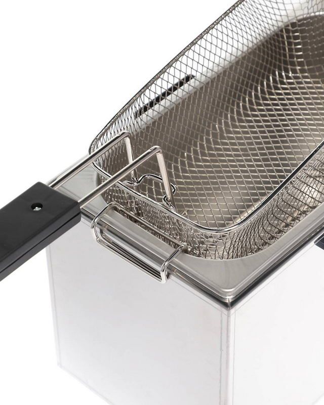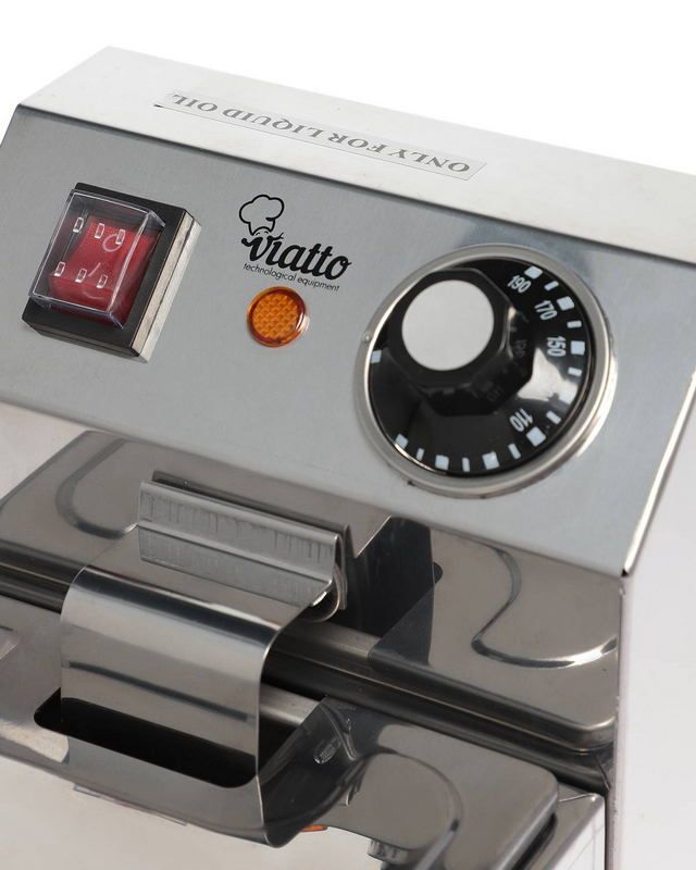 Viatto VA-DF4представляет собой электрическую фритюрницу. Аппарат предназначен для профессионального применения, он подходит для оборудования торговых точек, пунктов общественного питания. Модель рассчитана на приготовления различных продуктов в разогретом масле (картофеля фри, наггетсов). В конструкции установлен поворотный терморегулятор, позволяющий точно задавать температуру нагрева в диапазоне от 110 до 190 градусов. В модели предусмотрена одна ванна объемом 4 литра. В конструкции установлены теплоизолированные рукоятки для удобной переноски. Корпус фритюрницы выполнен из прочной нержавеющей стали, металл устойчив к коррозии.