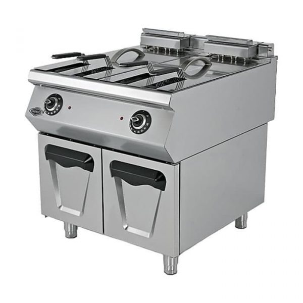 Фритюрница электрическая Empero EMP.7FE020-2016 рекомендованf для оснащения пунктов общественного питания, кафе, заведений фастфуда. Устройство обеспечивает приготовление наггетсов, креветок, картофеля фри в большом объеме масла. В конструкции предусмотрено две корзины, выполненные из нержавеющей стали.