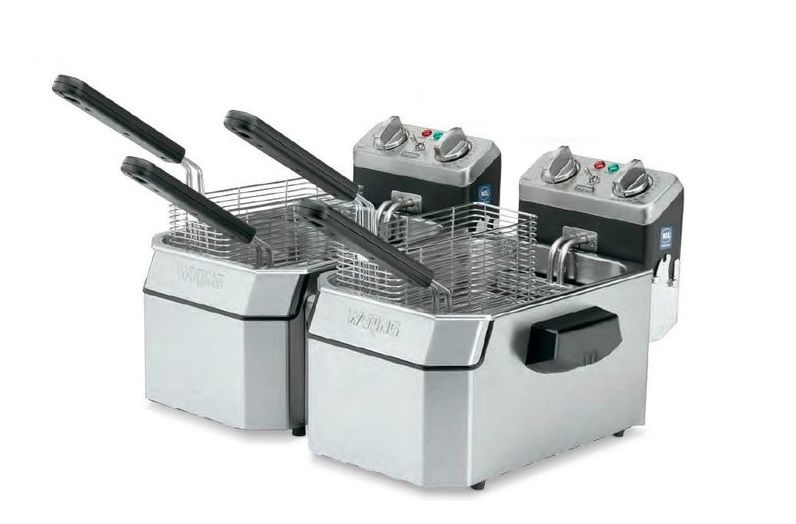 WARING WDF1000DEпредставляет собой фритюрницу профессионального класса настольного исполнения. Модель подходит для приготовления картофеля фри, наггетсов, овощей, птицы в большом объеме масла и жира. В конструкции предусмотрен термостат, тумблер для включения. В модели используется «холодная» зона, продлевающая срок использования масла. Нагревательный элемент, ванна и корпус изготовлены из нержавеющей стали. Корзины выполнены из нержавеющей стальной проволоки, оснащены съемной рукояткой.