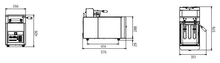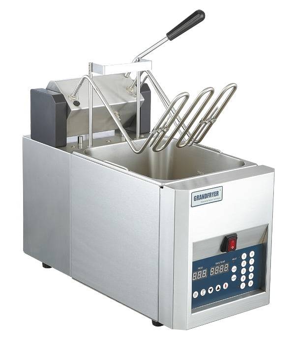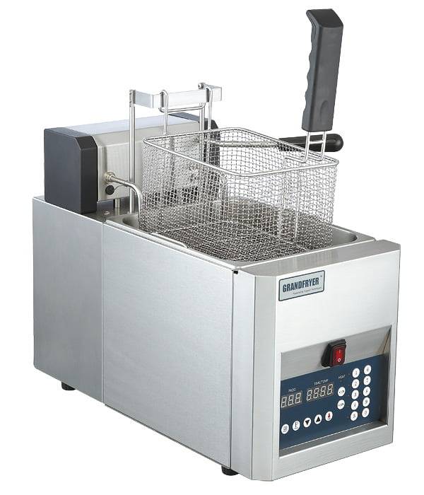 Фритюрница имеет программируемый компьютер с 9 кнопками меню. Присутствуют 3 программируемых этапа для каждого цикла приготовления блюда. Предусмотрены защитные переключатели опрокидывания и высокой температуры. При окончании процесса приготовления раздастся звуковой сигнал. Съемная ванна для жира помогает обеспечивать более быстрое и легкое очищение. Автоматический подъем корзины позволяет проводить процесс с минимальным контролем персонала. Благодаря своим небольшим размерам и дизайну подойдёт для компактных и открытых кухонь. В комплекте поставки есть 1 корзина.