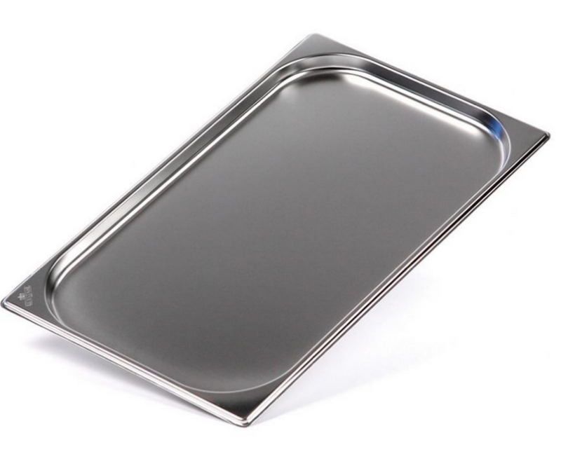 Емкость представляет собой низкий противень стандартного размера GN 1/1. Она изготовлена из пищевой нержавеющей стали, обладает загнутыми бортиками и закругленными углами. Идеально подходит для расстойки и выпекания кондитерских и хлебобулочных изделий.