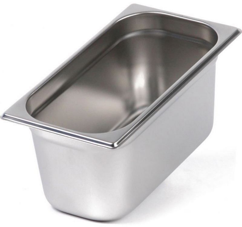 Гастроемкость изготовлена из пищевой нержавеющей стали, обладает стандартным размером GN 1/3 и большой глубиной. Она имеет скругленные углы, загнутые книзу бортики, подходит для тушения, приготовления соусов и подливок, выкладки штучной продукции и десертов.