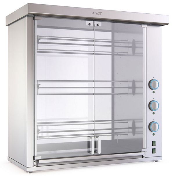 Гриль для кур АтесиКомандор-2/3 Соснащен тремя вместительными вертелами с электроприводом, которые смогут качественно прожарить до 15 кур за полтора часа. Аппарат незаменим для любых помещений быстрого питания: фуд-кортов, уличных павильонов, пиццерий и различных кафе. Имея компактные габариты и легкость очистки, изделие не доставит никаких проблем в использовании.