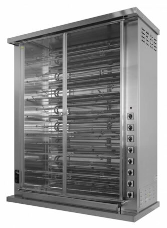 - Постоянная скорость вращения шампура и оптимальное расстояние от тушки до ТЭНов обеспечивают равномерную прожарку кур и высокую производительность гриля;