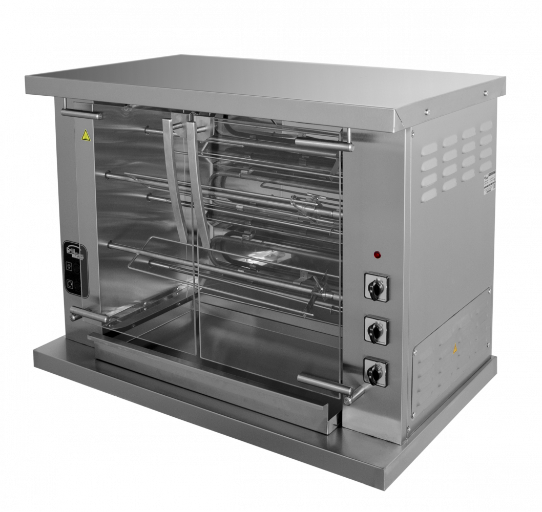 Гриль для кур GRILL MASTER Ф3У2Эпредназначен для приготовления кур-гриль и субпродуктов в заведениях быстрого питания, супермаркетах и уличной торговли. Благодаря непрерывному вращению тушек кур непосредственно возле нагревателей, обеспечивается их равномерное запекание. Корпус выполнен из пищевой нержавеющей стали, дверцы и задняя стенка — из закаленного стекла.