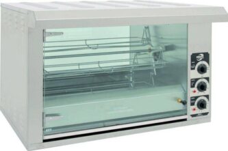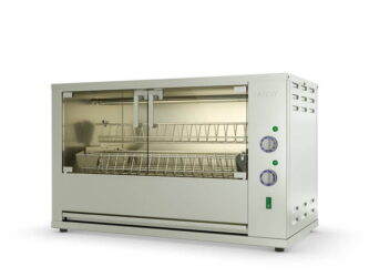 Имеет инфракрасные нагревательные элементы с независимым управлением. Камера оснащена подсветкой. Есть большой поддон для сбора лишнего жира. Корпус выполнен из нержавеющей стали, дверцы — из тонированного стекла.