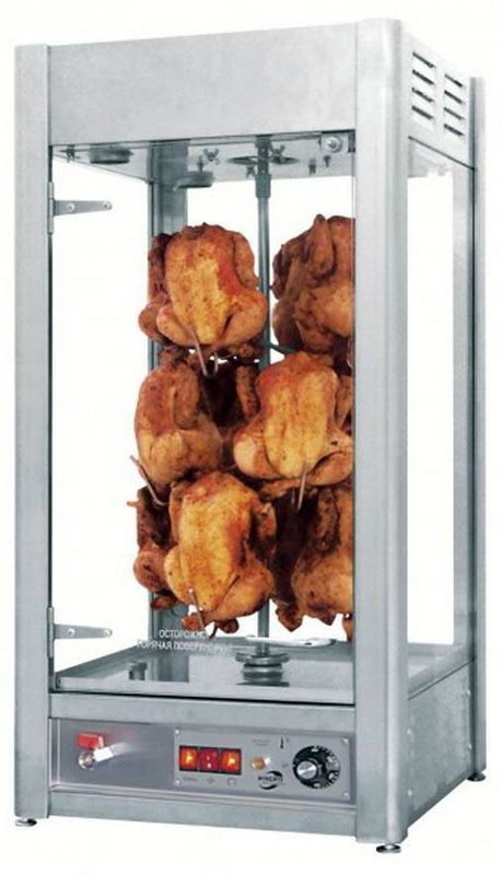 Вертикальный гриль оснащен производительным конвектором. Привод вертела надежно защищен от протечек. В конструкцию дна встроена сливная система. Аппарат предназначен для оборудования торговых точек, предлагающих клиентам готовых кур гриль.