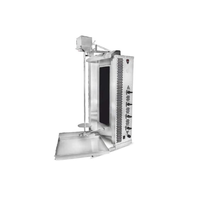 Гриль для шаурмы YUKON MED-04предназначен для жарки свиного, бараньего или куриного мяса, предварительно прошедшего процесс маринации, использованного для приготовления шаурмы, на предприятиях общественного питания. Принцип действия установки заключается в том, что мясная нарезка, сформированная в цилиндр, насаживается на специальный нож и вращается около электронагревателей до его готовности. Все элементы, контактирующие с пищей, изготовлены из материалов, разрешенных для контакта с пищевыми продуктами.