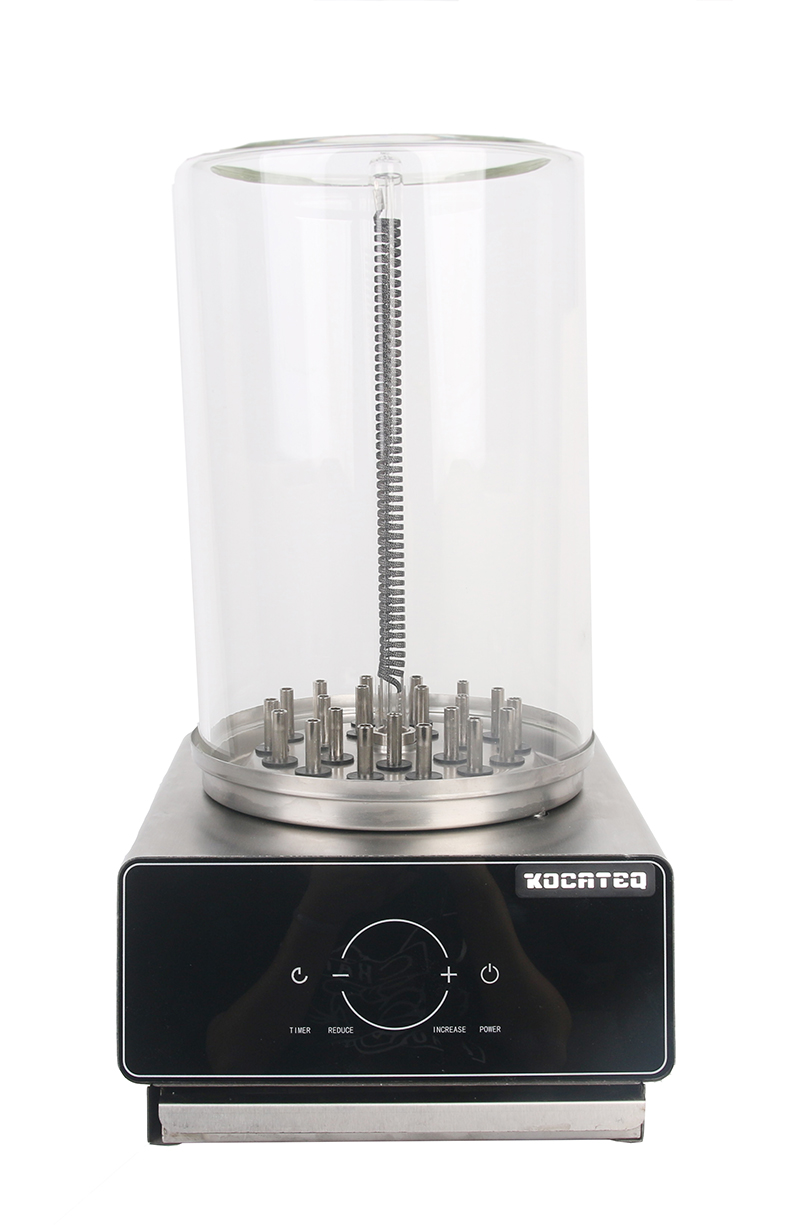 Гриль-мангал Kocateq DH Churrasco 30/1,8 — профессиональное оборудование, используемое в кафе, закусочных, барах, в уличных точках быстрого питания для приготовления сочного мяса и овощей на деревянных шпажках. Это компактное настольное устройство в виде вертикальной колбы и основания, в котором установлены втулки с отверстиями для шпажек.