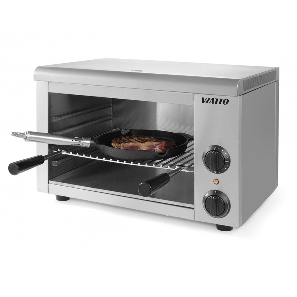 Viatto HES-938 представляет собой гриль типа Salamander. Модель предназначена для приготовления широкого спектра блюд, в том числе стейков из рыбы, мяса, гамбургеров, горячих бутербродов и так далее. В конструкции предусмотрена система поддержания готовых блюд в горячем виде. Дополнительно присутствует таймер длительностью до 15 минут, высота установки решетки регулируется. В качестве материала изготовления корпуса применяется нержавеющая сталь. Аппарат отлично подходит для оснащения кафе, фуд-кортов, торговых центров и так далее.