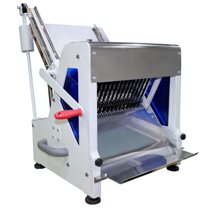 - Оснащена механизмом принудительной подачи буханок и батонов хлеба в зону резки, для этого на наклонном подающем столе установлено приспособление, состоящее из каретки, с установленным на ней гребенчатым толкателем. Это дает возможность работать на машине одному человеку;