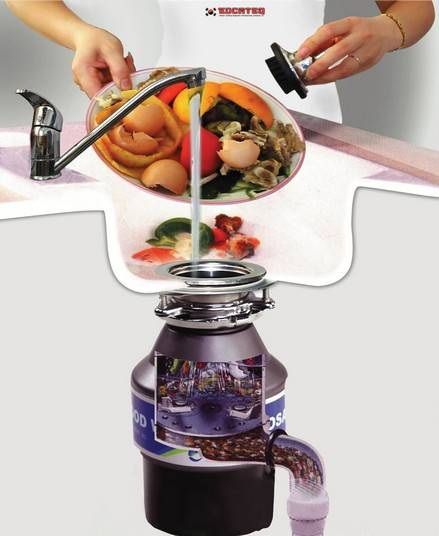 Конструкция прибора включает в себя узел подключения к сливному отверстию мойки, камеру измельчения с усиленными ножами, индукционный двигатель. Измельчитель перемалывает остатки пищи, смешивает их с водой и выводит в канализацию.