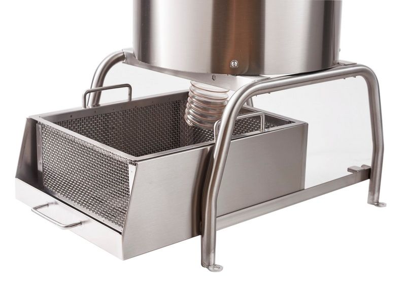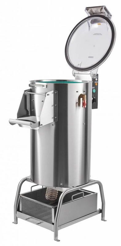Картофелечистка оснащена таймером с поворотным регулятором. Выгружаются очищенные овощи под воздействием центробежной силы. Кожура и отработанная вода через сливной шланг поступают в мезгосборник.