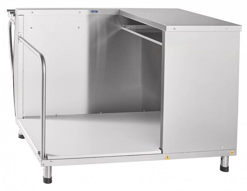 Кабина представляет собой полуоткрытый модуль со столом и свободной частью для установки кассового аппарата. Модель оснащена регулируемыми ножками, направляющими для подносов, встроенной розеткой с заземлением. Кабина выполнена из нержавеющей стали и имеет выгнутую переднюю панель, кашированную под дерево.