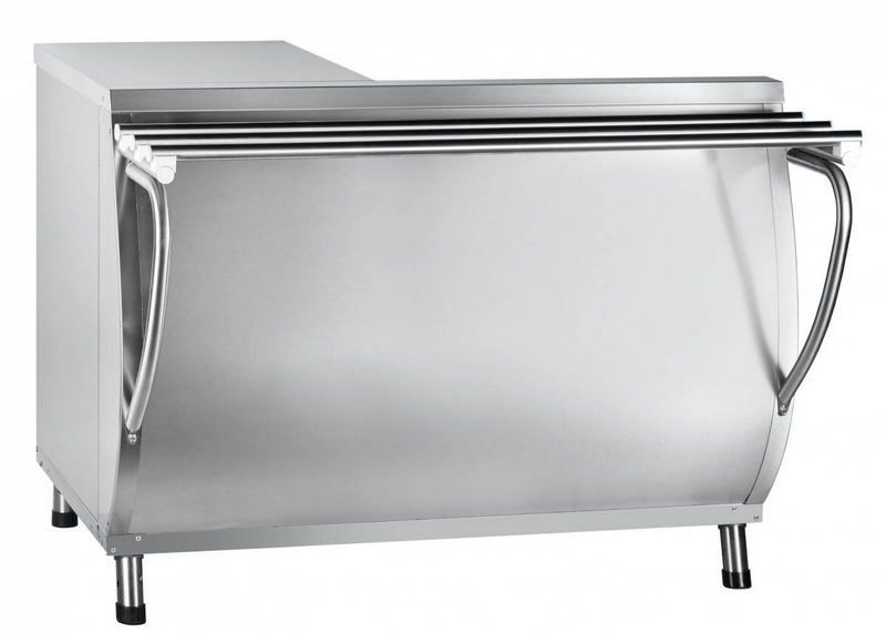 Оснащена полкой, расположенной под столешницей. Имеет регулируемые по высоте ножки. Столешница и направляющие для подносов изготовлены из нержавеющей стали, обшивка — из окрашенного оцинкованного металла. Оборудование может использоваться как отдельно, так и в составе линий раздачи.