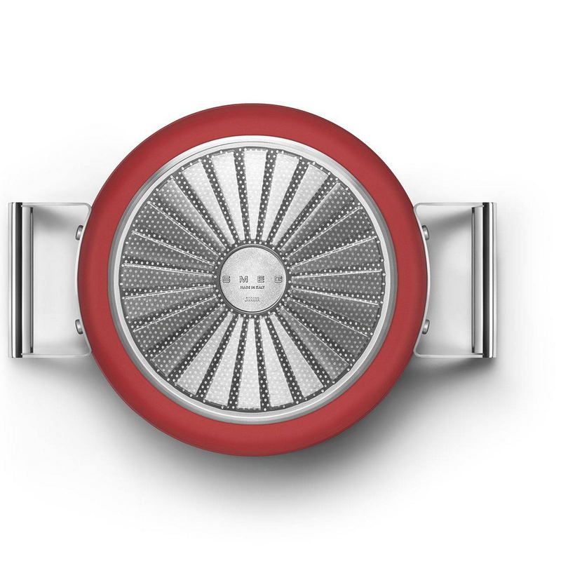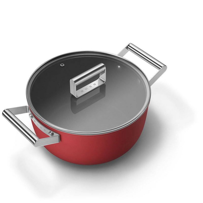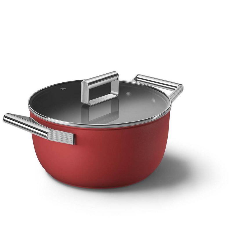 SMEG CKFC2411RDMпредставляет собой кастрюлю для приготовления разнообразных блюд. Модель подходит для домашнего и профессионального использования. Посуда выполнена в стиле 1950-х годов. Корпус выполнен из холоднокатаного алюминия. На внутреннюю поверхность нанесено трехслойное антипригарное покрытие с керамическими частицами. На дне предусмотрена накладка из нержавеющей стали, она позволяет использовать посуду на любых типах плит, включая индукционные. В набор поставки входит крышка из закаленного стекла с рамкой из нержавеющей стали.