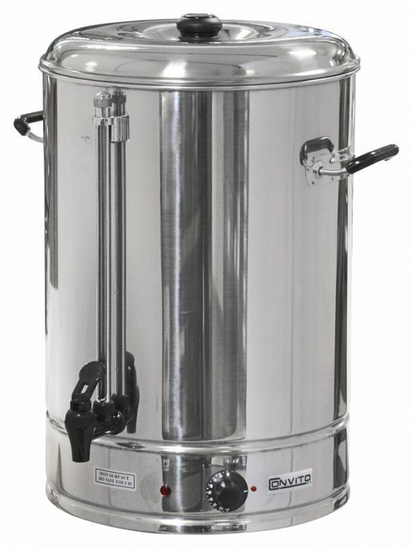 Кипятильник Convito WB-30A выполнен полностью из нержавеющего пищевого сплава, вмещает 30 литров, обеспечивает быстрый нагрев за счёт мощного ТЭНа, который закрыт и не контактирует с нагреваемой водой. На фронтальной части расположена шкала, которая позволяет контролировать уровень воды в баке и разливной краник. Регулировка температур нагрева осуществляется посредством удобного большого терморегулятора.