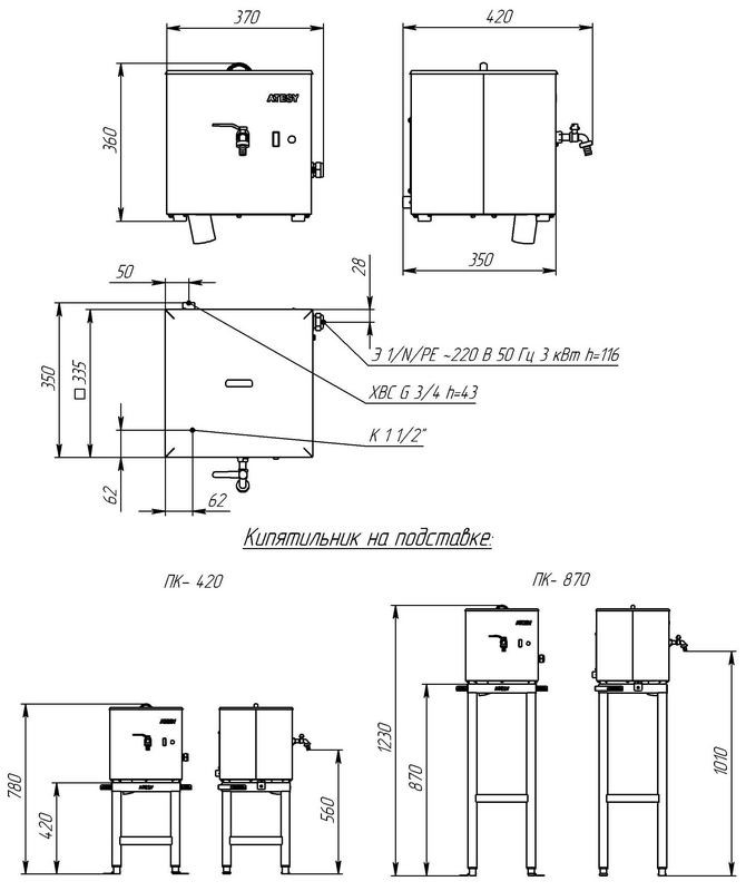 Специально для кипятильника разработаны подставки серии ПК-3 и серии ПК-5 (высотой 420 мм и 870 мм) для удобной эксплуатации аппарата.